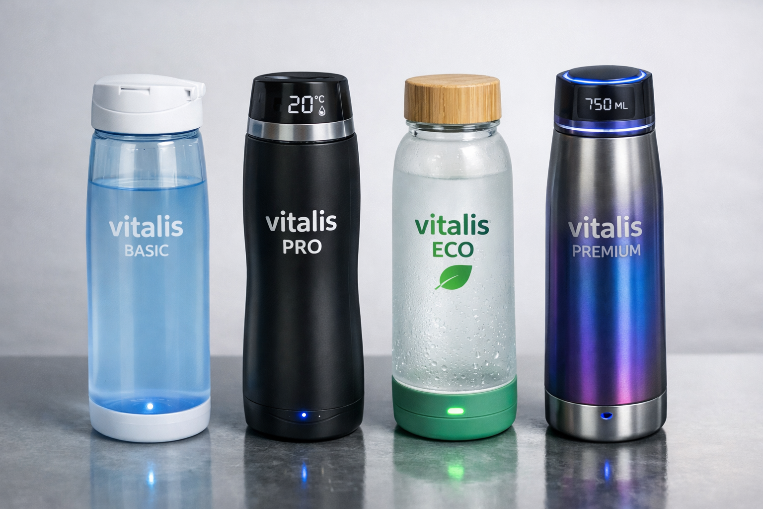 Descubre nuestra gama de botellas de agua inteligentes Vitalis, diseñadas para ayudarte a mantenerte hidratado de forma sencilla, saludable y sostenible gracias a la tecnología.